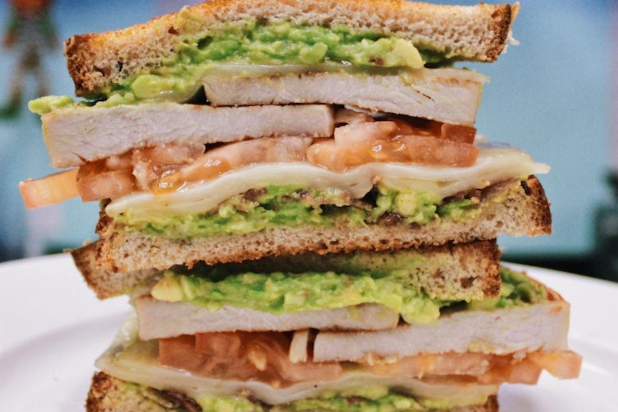 Avocado, turkey, bacon, and tomato in between a grilled cheese
