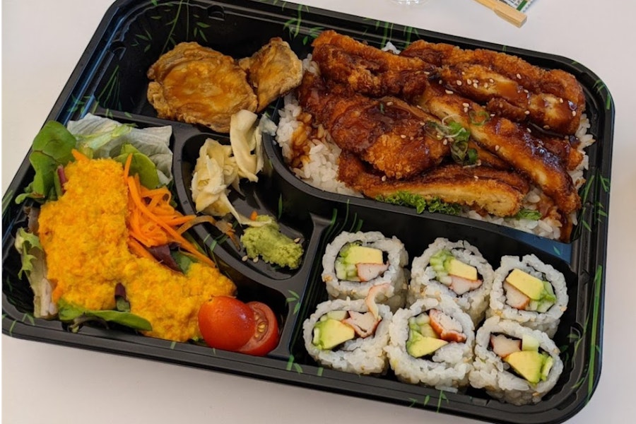 Served with jasmine rice, a california roll, veggie kakiage, and salad