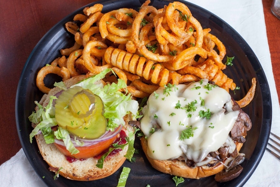 Ground turkey patty, cranberry spread, swiss cheese, shredded lettuce, wild mushrooms, onions and pickles