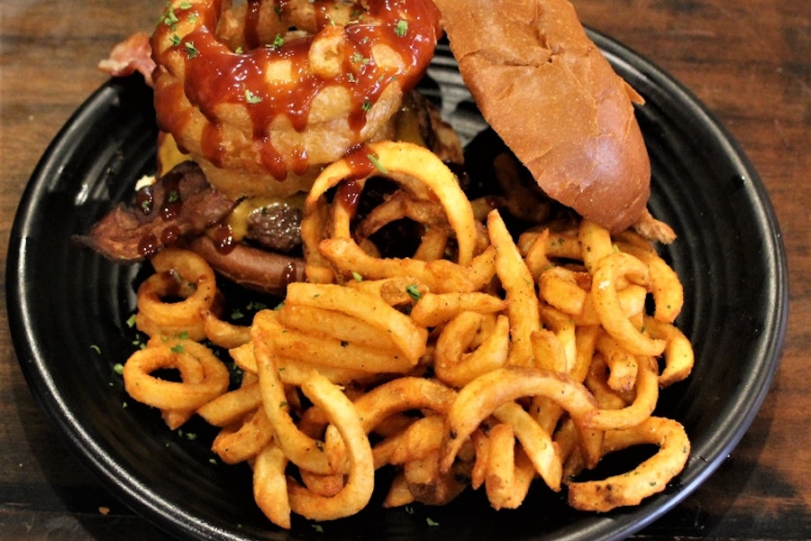 Ground turkey patty, cheddar cheese, crispy hardwood smoked honey-cured bacon, topped with onion rings drizzled with bbq sauce
