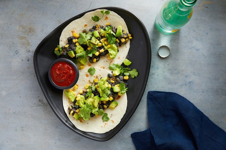 Flour tortilla, refried black beans, fresh avocado, roasted corn, fresh cilantro, salt & pepper
