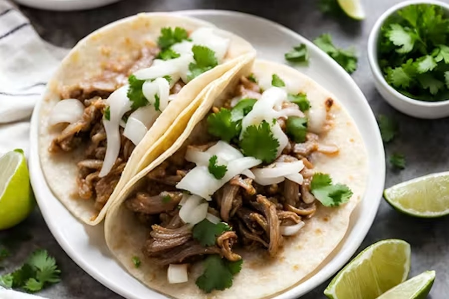 Flour tortilla, slow-cooked yucatan pork topped with pickled red onions