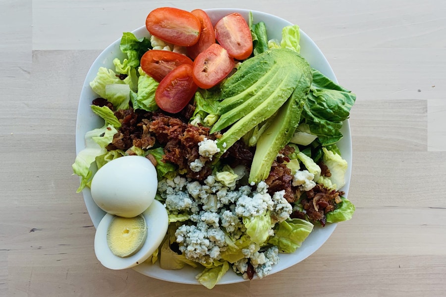 Hardboiled egg, bacon, avocado, tomato, blue cheese with blue cheese dressing