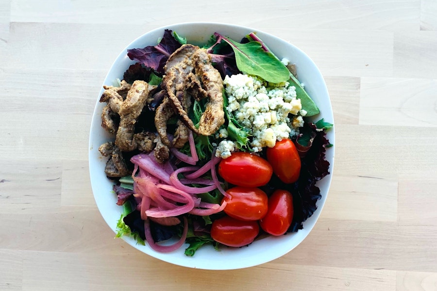 Tomatoes, onion, blue cheese, steak with raspberry balsamic dressing