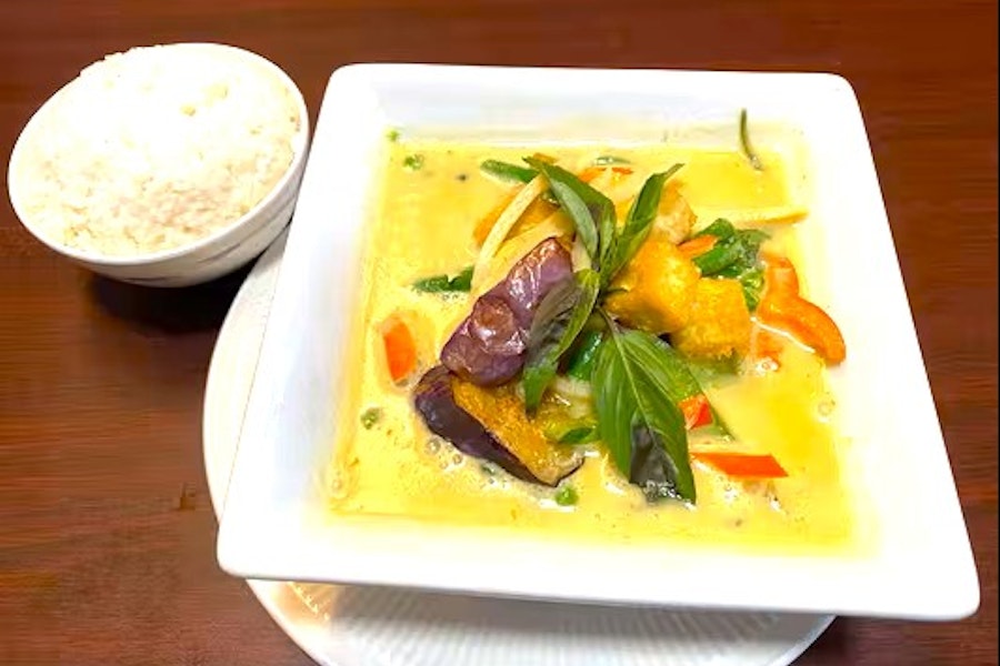 Fresh mango, onions, red-green pepper, carrot and tomato in a yellow coconut milk curry