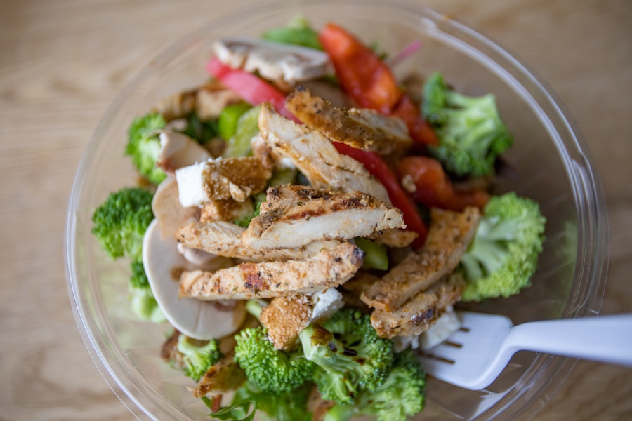 Grilled chicken breast, kale, shaved brussels sprouts, parmesan cheese, pepitas, and a homemade caesar dressing
