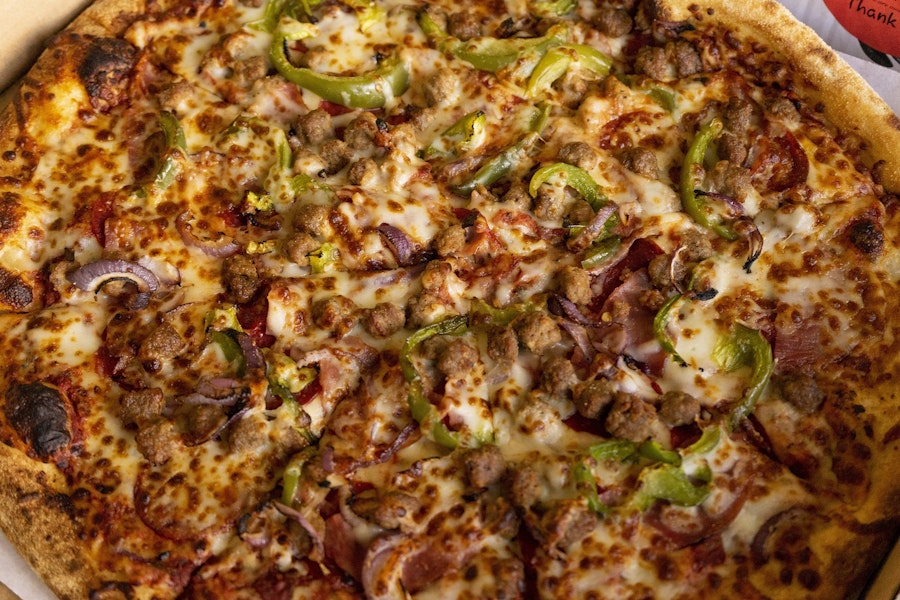 Pepperoni, sausage, fresh mushrooms, black olives, and red onions