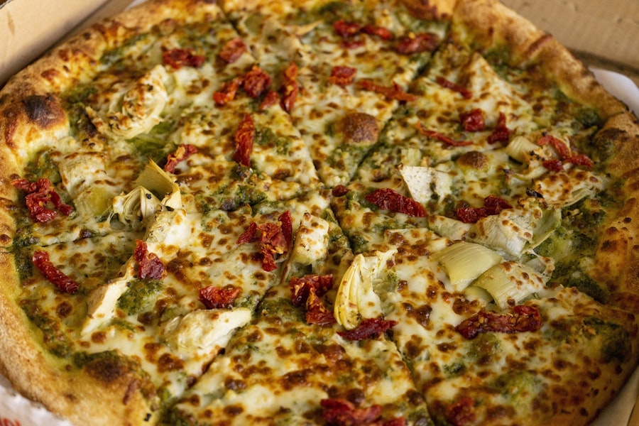 Marinated artichoke hearts, sundried tomatoes, and garlic with nut-free pesto sauce