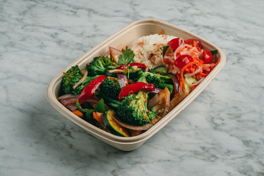Rice with roasted cauliflower, pickled carrots, daikon, and cucumbers - served with your choice of sauce. No crispy shallots