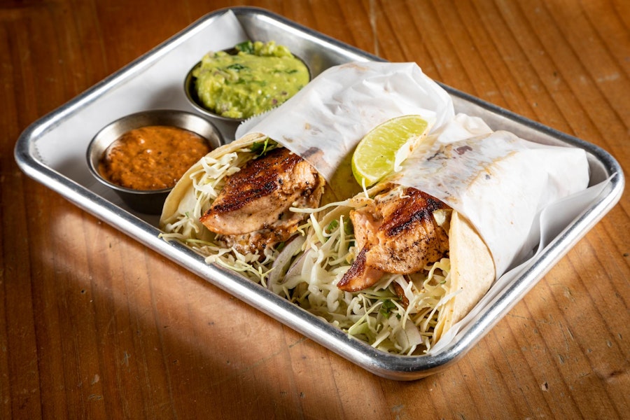 Grilled salmon with cabbage, cilantro, red onion, lime aioli, house-made roasted tomato salsa & guacamole - two tacos per box