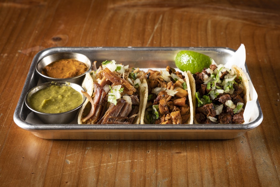 Three shredded beef tacos with oaxaca cheese, onions, and cilantro folded into griddled corn tortillas. Served with a side of consommé