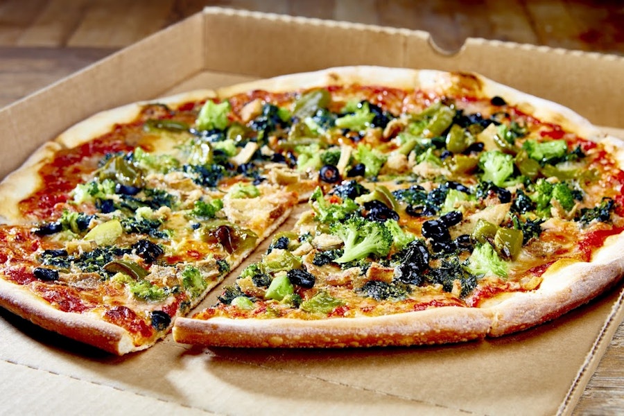 A very popular five topping veggie pizza that boasts of fresh green peppers, black olives, broccoli, baked eggplant, spinach and last but not least 100% pure mozzarella cheese