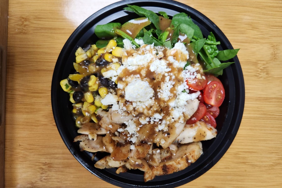 Grilled chicken, black beans, corn, feta cheese, cherry tomatoes, chopped spinach, quinoa, balsamic dressing