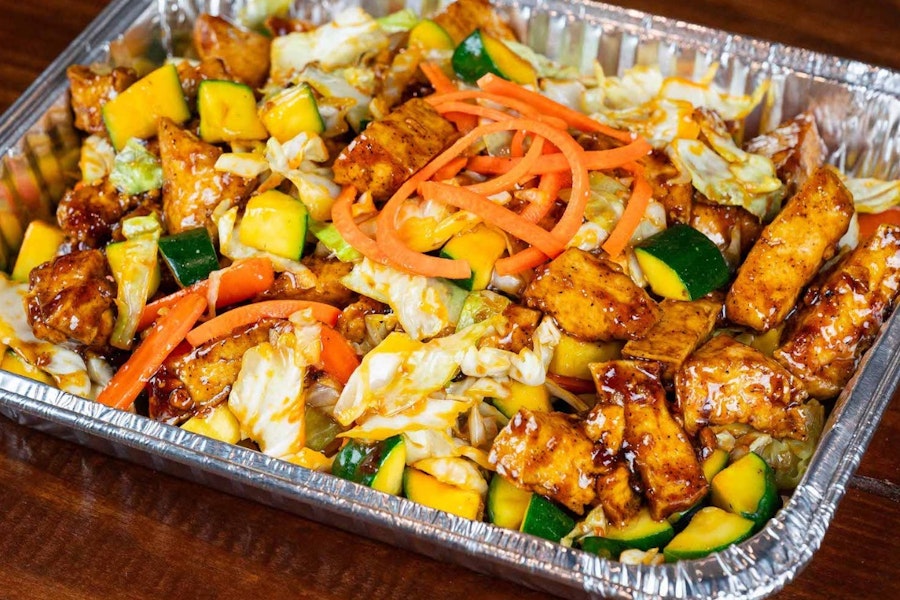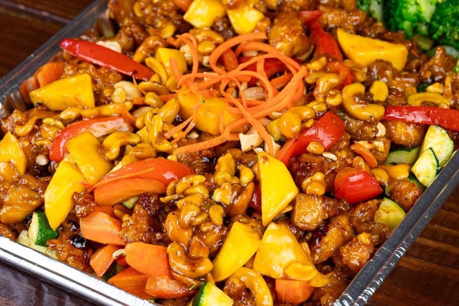 Deep-fried tofu, mango, carrot, broccoli, onion, zucchini, bell pepper, hot chili peppers, cashews, and house-made mango sauce