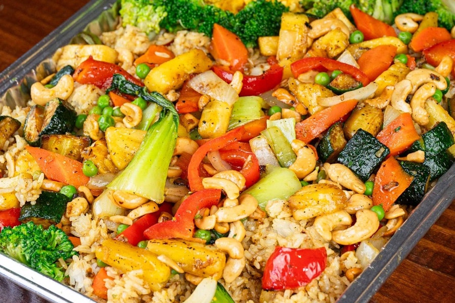 Thai fried rice with peppers, cashews, carrots, eggs, onions, pineapples, onions, and your choice of protein or vegetables
