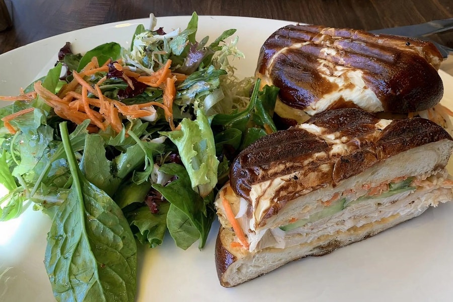 Sesame ginger chicken, pickled carrots & daikon, jalapeno, cucumber, cilantro, sriracha mayo, on pretzel bun. Comes with your choice of salad & a cookie