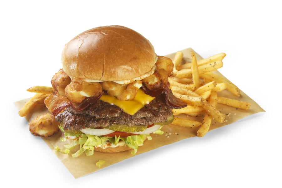 Hand smashed double patty, American cheese, bacon, shredded lettuce, tomato, pickles, mustard, mayo, challah bun