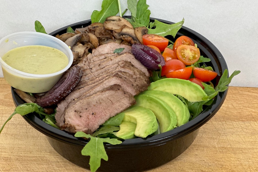 Charred hanger steak with grilled mushrooms, crispy onions, sliced avocado, cherry tomato and secret dressing