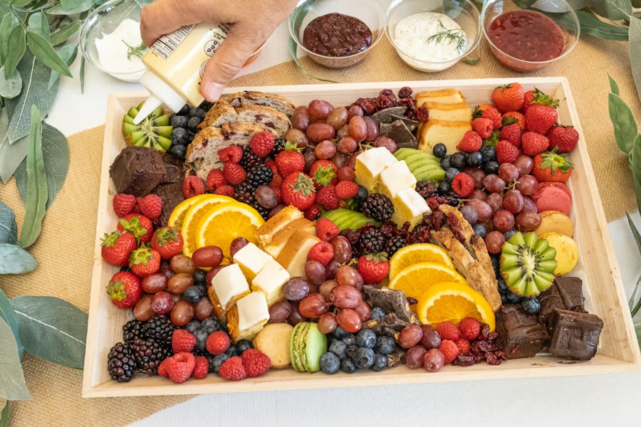 Nutella®, honey, syrup, everything bagel cream cheese, dessert bread, hazelnut mignon, danish, mini pancakes, beignet, hard-boiled eggs, fennel spiced ham, italian prosciutto, bacon twists, honeydew, cantaloupe, orange, grapes, kiwi, strawberry, blackberry, blueberry, raspberry, mixed nuts, brie wedges