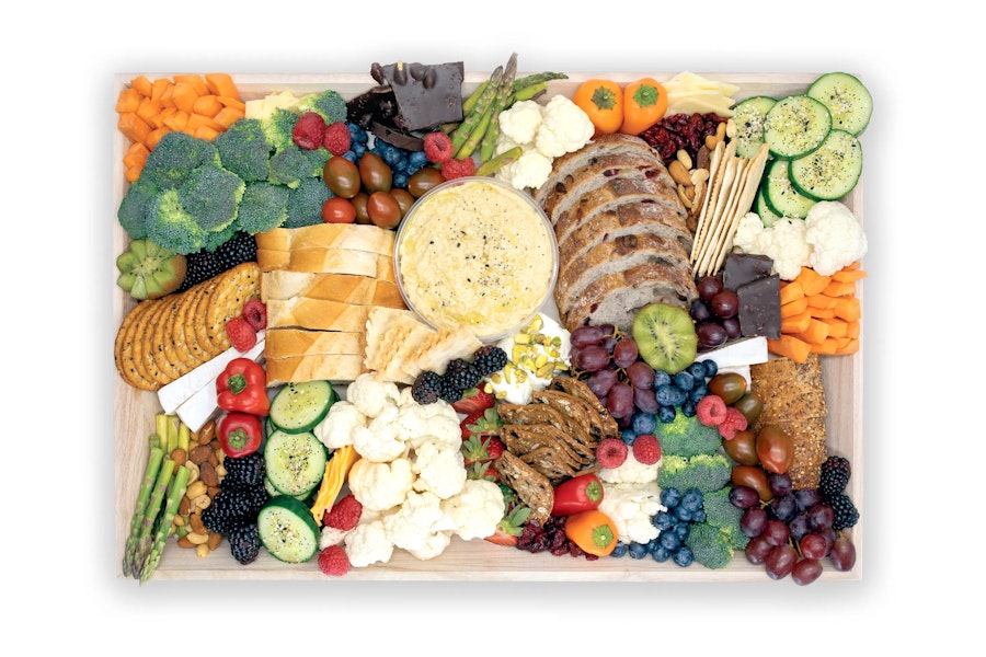 Classic and roasted red pepper hummus, cottage cheese dill dip, cranberry orange jam, raspberry jam, lemon dill mayo, spicy brown mustard, honey, baguette bread, sweet dessert bread, seeded bread, hot soppressata, peppered salami, sweet coppa, prosciutto, fennel spiced ham, brie wedges, assorted cheese slices, goat cheese garnished with honey and pistachios, raincoast crackers, rosemary crackers, cracked pepper crackers, wheat crackers, cherry tomatoes, mini cucumbers seasoned with everything bagel seasoning, carrots, kiwi, blackberries, blueberries, raspberries, strawberries, grapes, sweet mini bell peppers, craisins, assorted mixed nuts, dark chocolate bark (pistachio and pink himalayan sea salt)