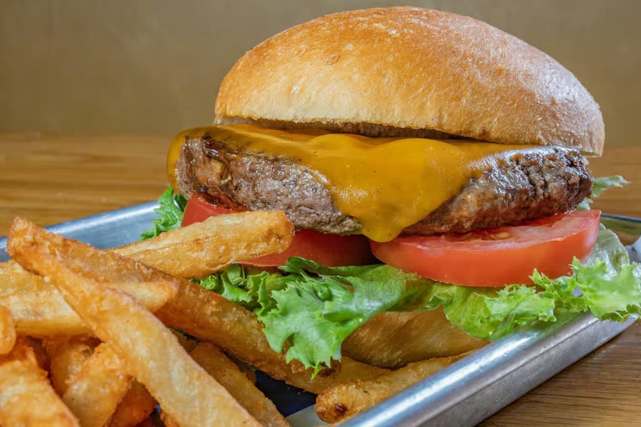 Burgers are served with french fries