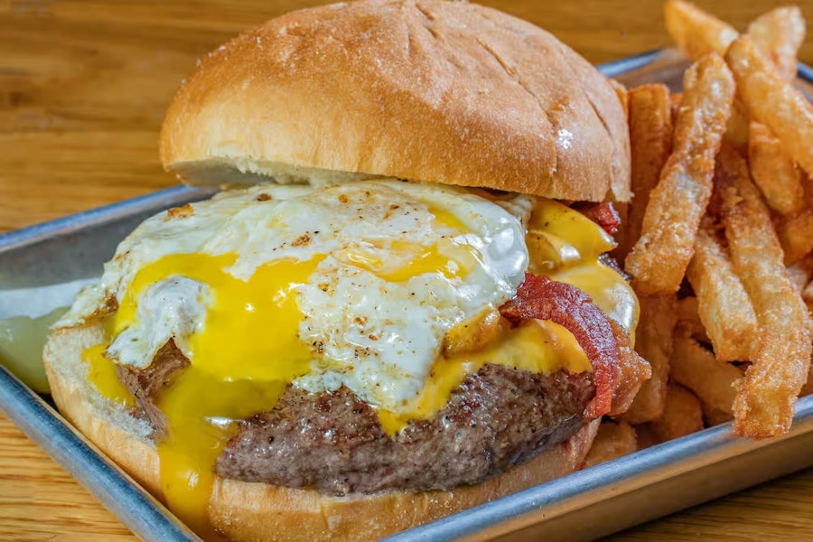 Angus beef patty with fried egg, crispy bacon bits, cheddar cheese, and chipotle aioli