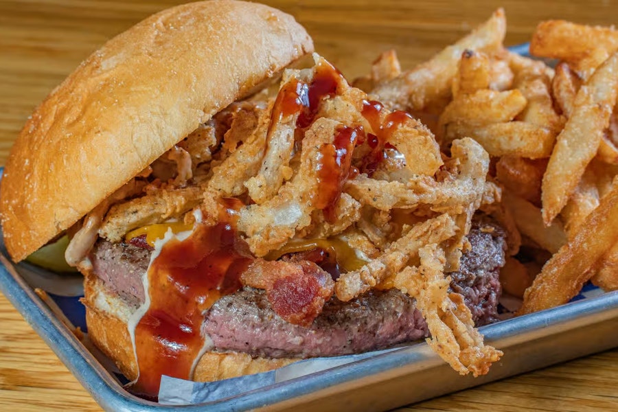 Angus beef patty with sweet & tangy bbq sauce, fried onions, pickles, cheddar cheese, and bacon