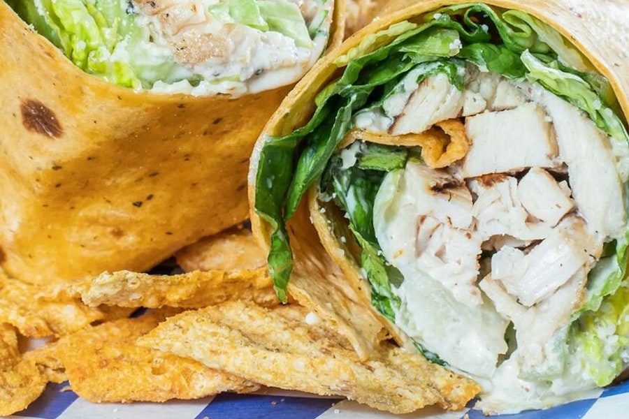 Each box includes a so cal wrap (grilled chicken, bacon, jack cheese, romaine lettuce, avocado & smoked bacon ranch dressing) and chips