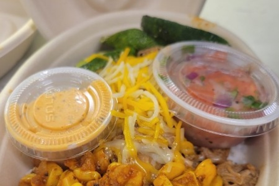 Rice topped with pico de gallo, chipotle grilled corn, zucchini, cheddar jack cheese, citrus mojo pork