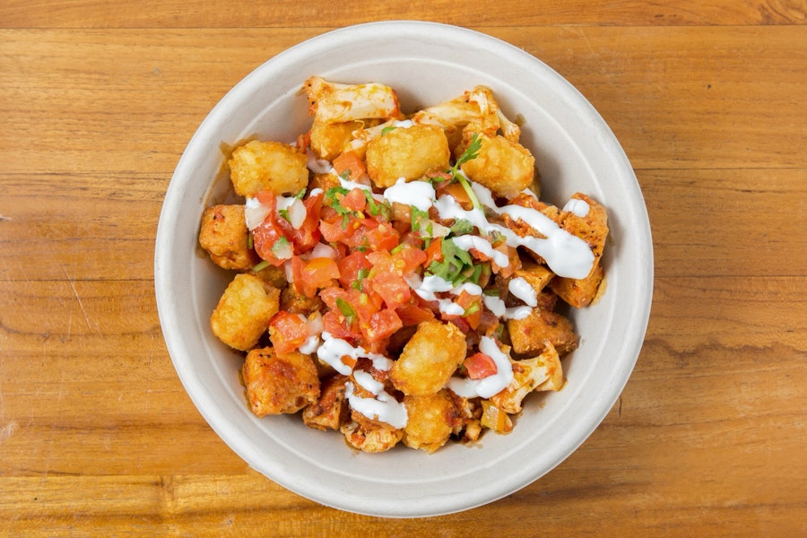 Roasted cauliflower and tofu in chipotle tinga sauce, cheddar jack cheese, pico de gallo, and sour cream