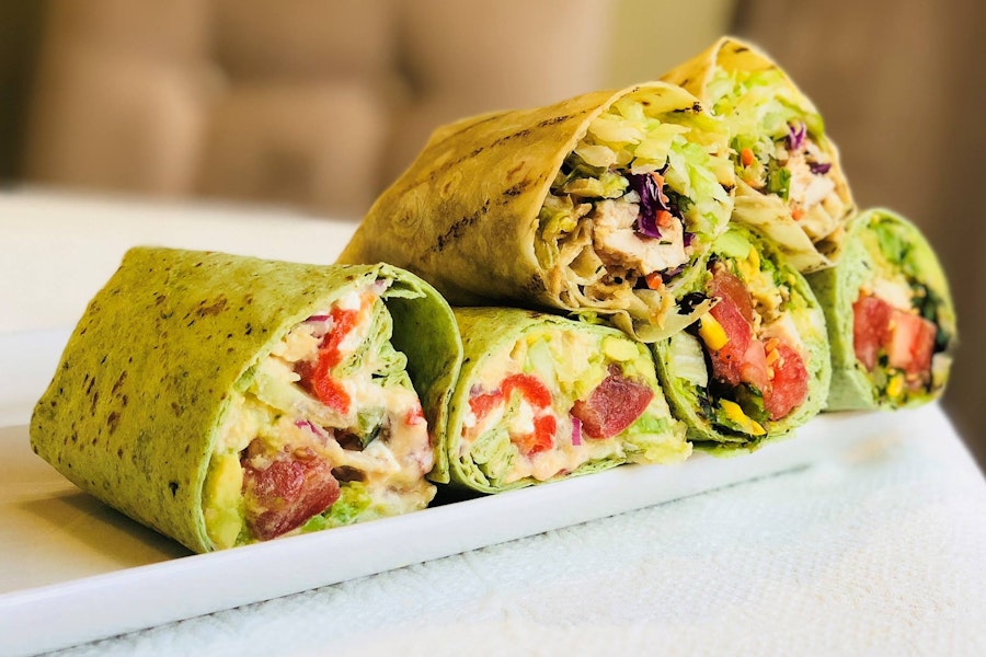 Grilled chicken, avocado, tomatoes, black bean & corn salsa, cheddar cheese, tortilla strips & pepitas dressing, wrapped in a spinach tortilla