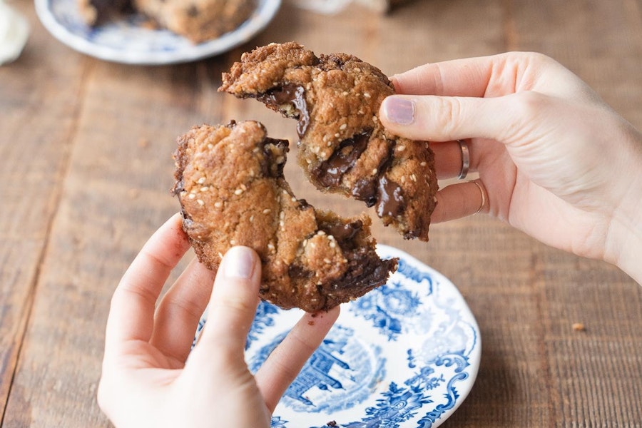 With pops of sesame seeds & dark chocolate chunks from ecuador