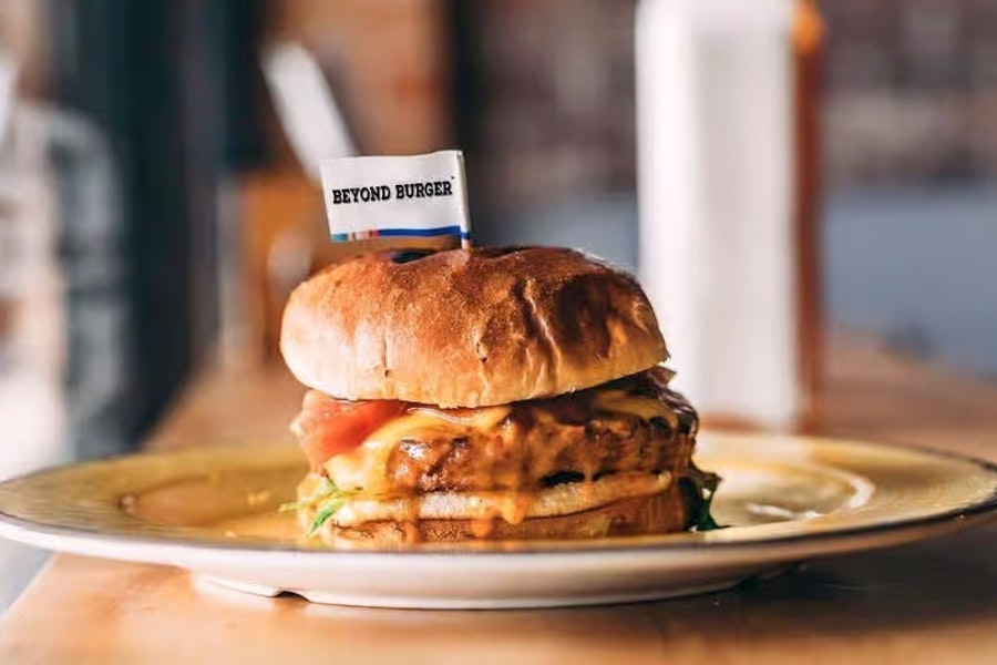 Non-gmo vegan plant-based burger with lettuce, tomato and perimayo on ciabatta