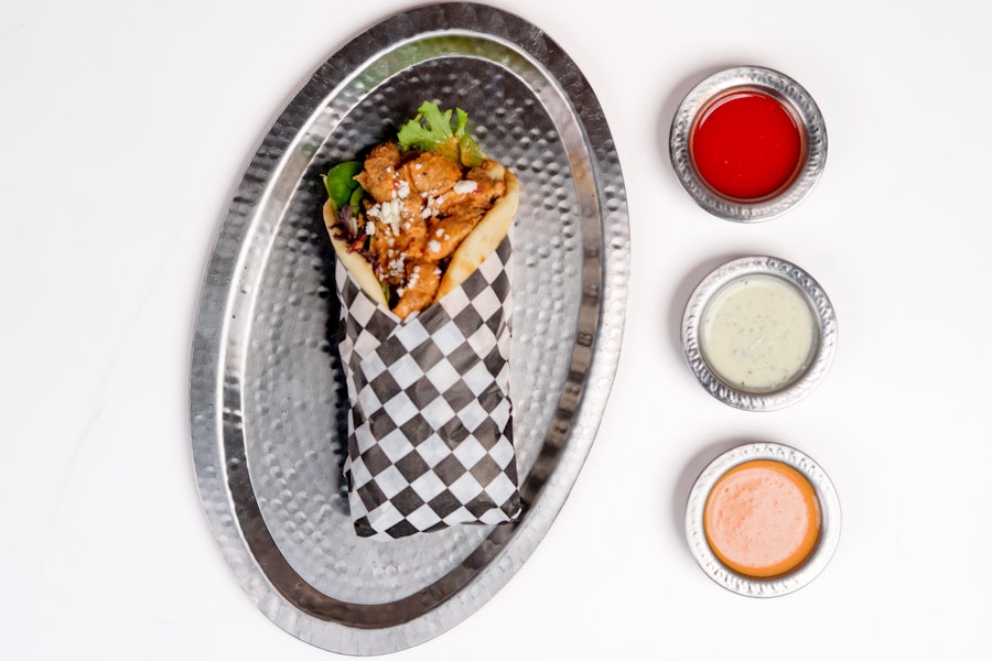 Hummus, tzatziki, spring mix, chicken gyro, feta cheese, orange sauce. Comes with orange sauce, yogurt sauce, and hot sauce on the side