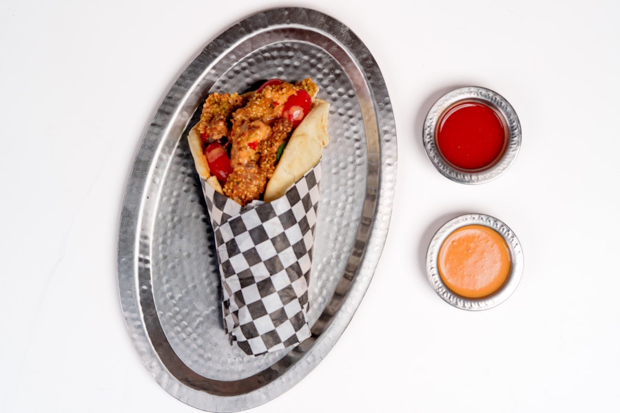 Hummus, spring mix, falafels, tomatoes, orange sauce. Comes with orange sauce and hot sauce on the side