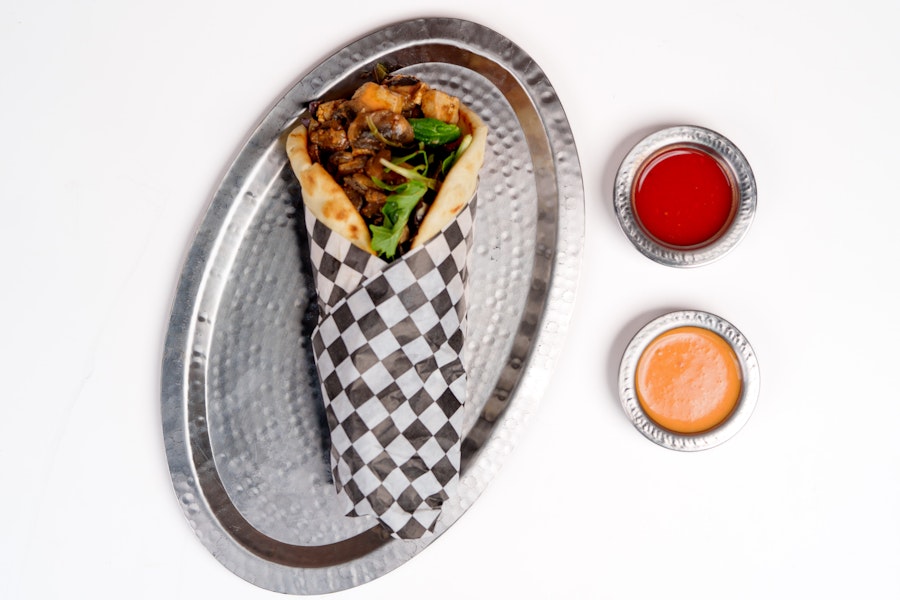 Hummus, vegan gyro (tofu, mushroom tomato, onion sautéed), spring mix, orange sauce. Comes with orange sauce and hot sauce on the side