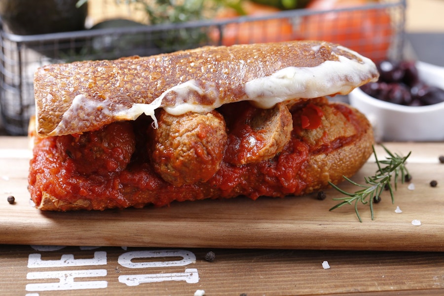 Toasted. Meatballs, marinara sauce, and mozzarella cheese