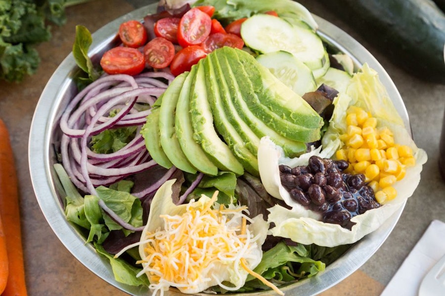 Romaine & mixed greens with avocado, corn, black beans, shredded cheese, cucumber, tomatoes, red onions with creamy chipotle-lime dressing