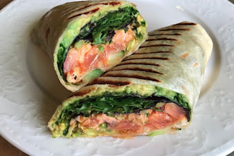 Fresh salmon marinated in a mix of spicy garlic chili and sweet teriyaki sauce with mixed greens, avocado, sprouts, cucumber, and chipotle aioli in grilled tortilla
