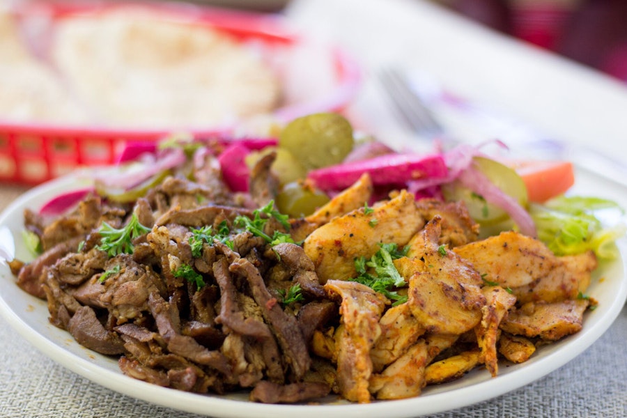 Seasoned, slowly roasted chicken and lamb, shaved thinly