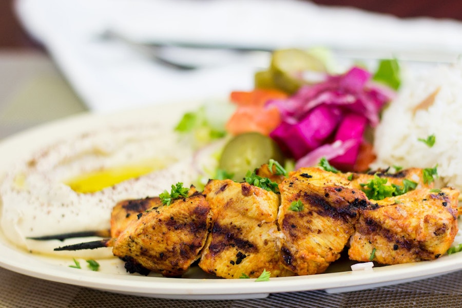 Tender marinated chicken on a skewer charbroiled then pulled onto lavash bread with lettuce, tomatoes, and onions