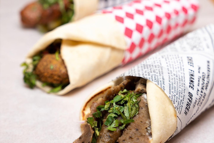 Spit-roasted beef, lettuce, tomatoes, onions, and tzatziki (yogurt-cucumber sauce) in pita bread