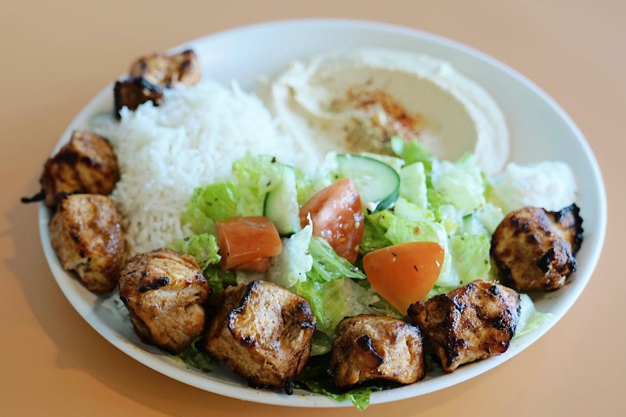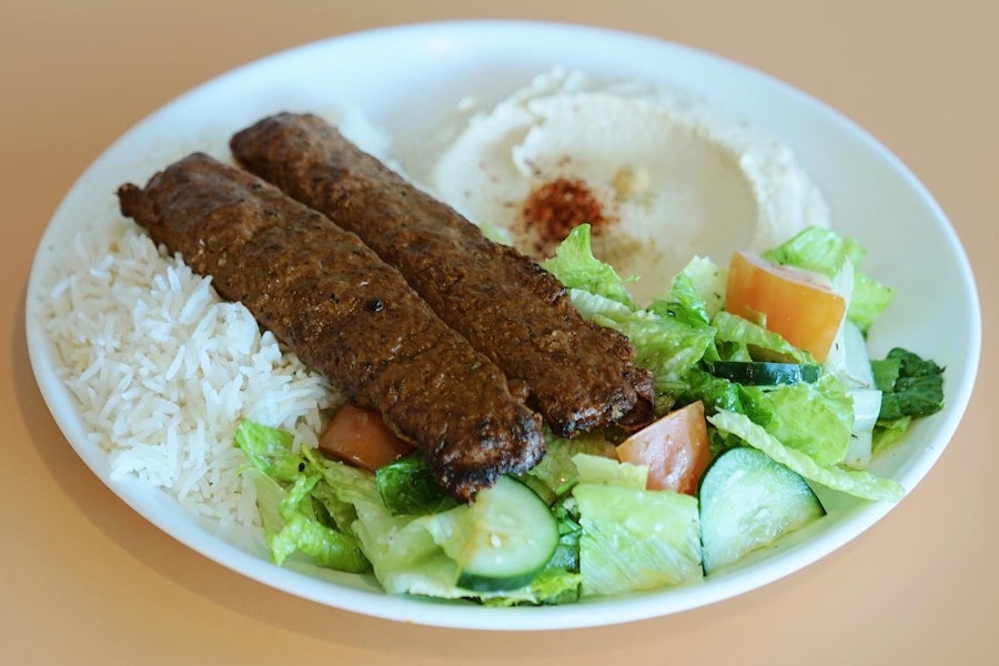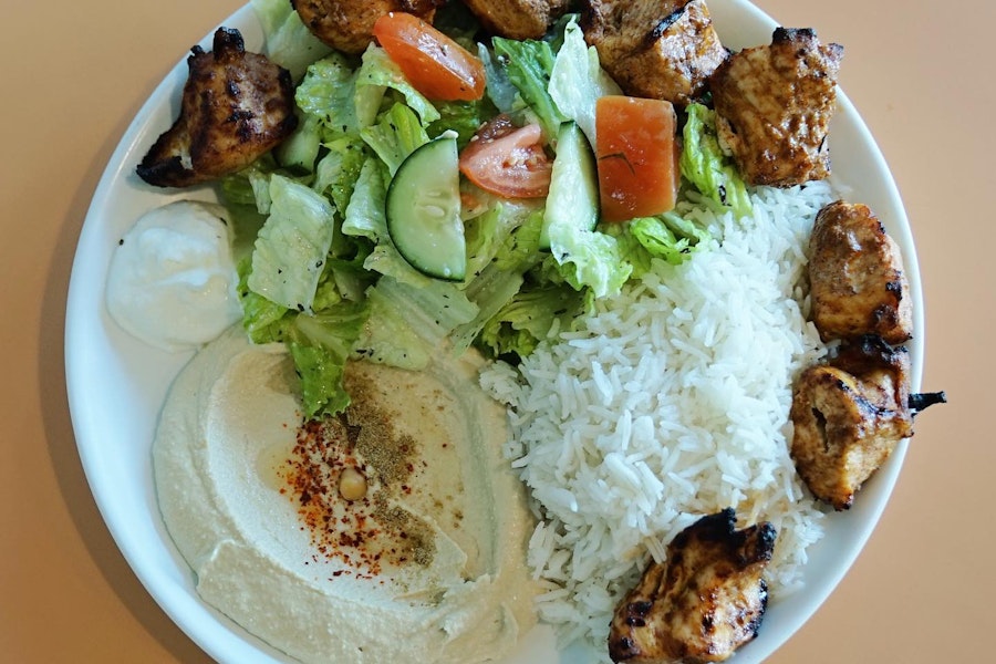 Includes hummus, falafel, baba ghanoush, grape leaves, and tabbouleh. Served with pita bread