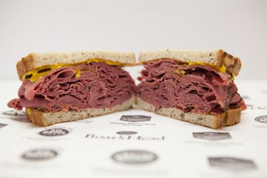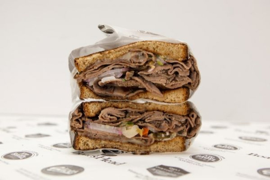 Warm roast beef on wheat bread, melted horseradish cheddar cheese, red onions, cilantro, horseradish sauce, and giardiniera peppers