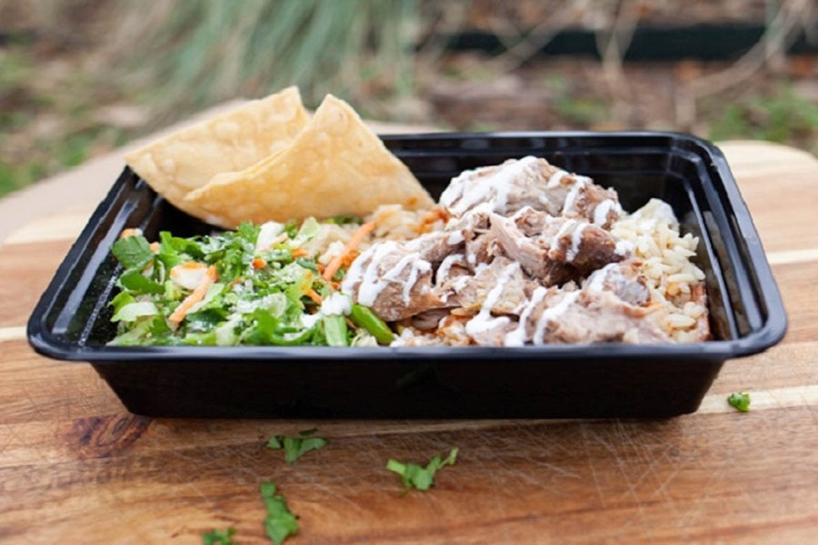 Each bowl comes with a hearty portion of white steamed rice with onions, lettuce, cilantro, and tortilla chips