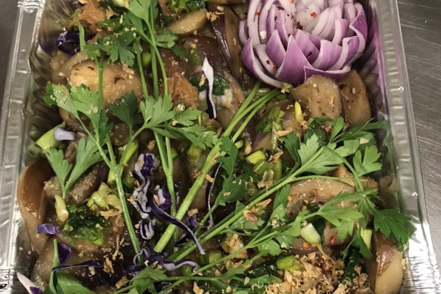 Eggplant and fried tofu (contains traces of egg) braised with a kick of savory and sweet chili spice, garnished with fresh green herbs, sesame seeds, and fried shallots