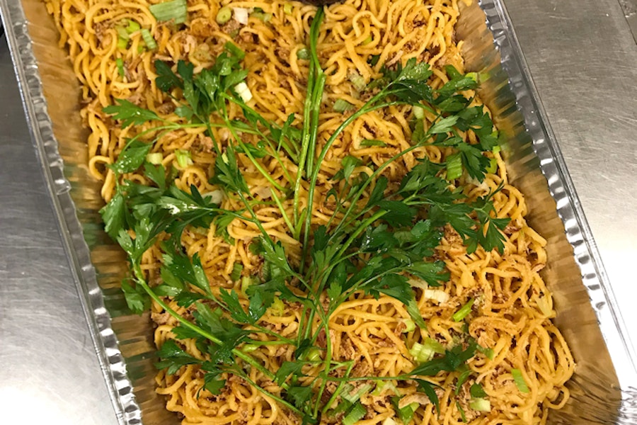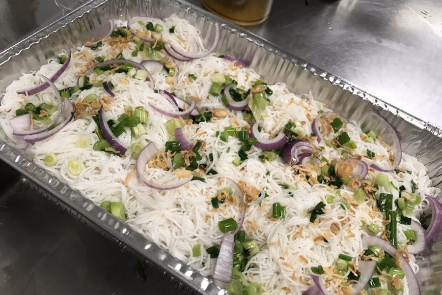 Rice noodles garnished with fried shallots, sautéed red and green onions