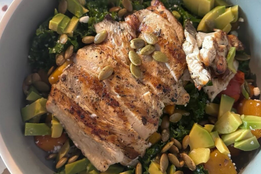 Chicken, kale, avocado, tomatoes, goat cheese, caramelized pumpkin, pumpkin seeds, Rosemary vinaigrette