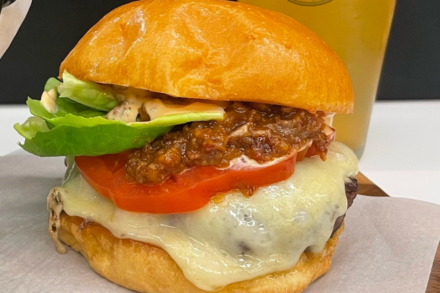 White american, swiss, onion jam, lettuce, tomatoes, spicy aioli