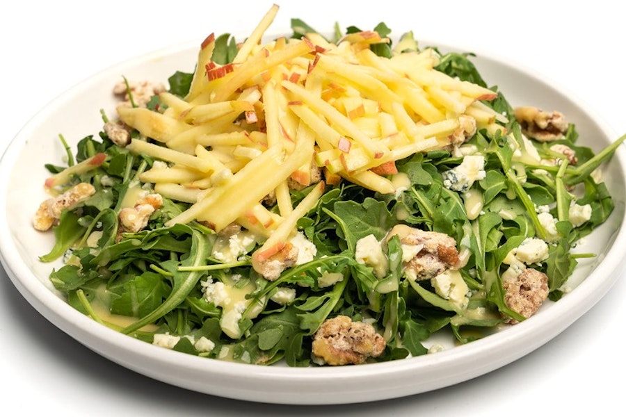 Organic arugula with shaved apples, blue cheese, candied walnuts, and apple cider vinaigrette dressing. Served with a side of baguette (baguette is not gluten-free)
